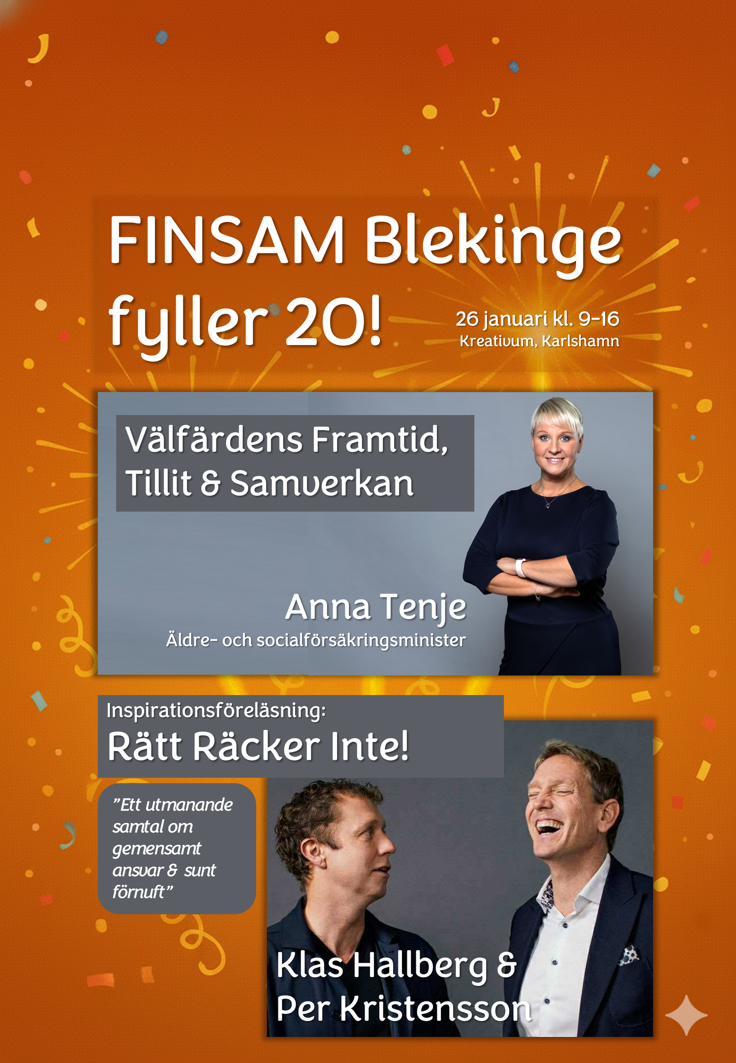 På Kreativum möter du äldre- och socialförsäkringsminister Anna Tenje och inspiratörerna Klas Hallberg och Per Kristensson, som mästerligt gör det komplexa enkelt. Säkra din plats idag!