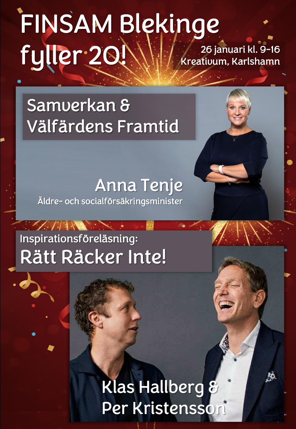 På Kreativum möter du äldre- och socialförsäkringsminister Anna Tenje och inspiratörerna Klas Hallberg och Per Kristensson, som mästerligt gör det komplexa enkelt. Säkra din plats idag!